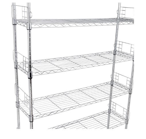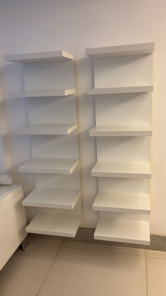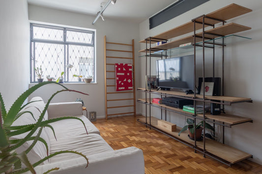 Estante em estrutura metálica com prateleiras em madeira e vidro
