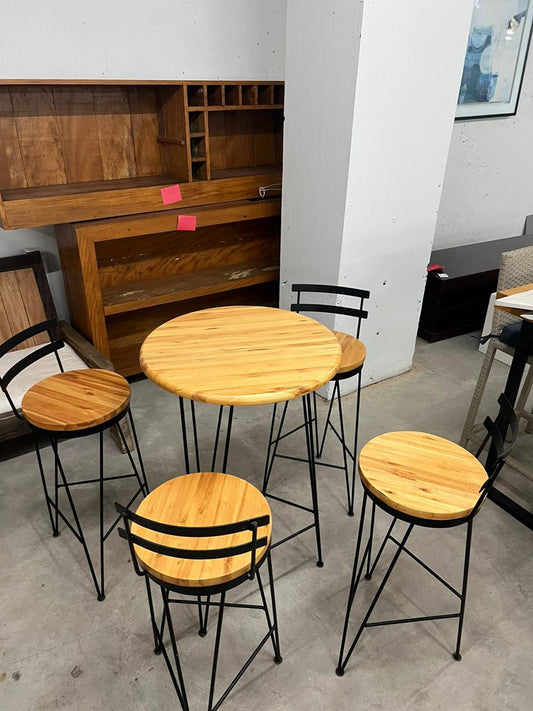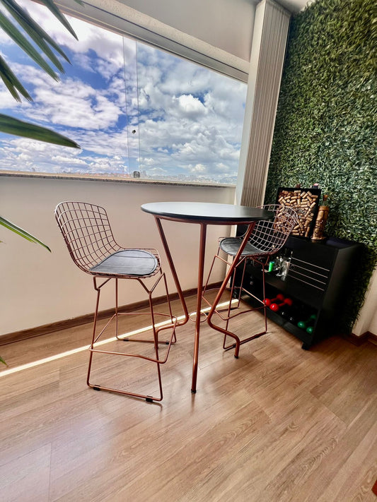 Mesa bistrô tampo madeira preto e pés de ferro bronze e 2 banquetas em ferro bronze e acento couro preto Vitória Móveis