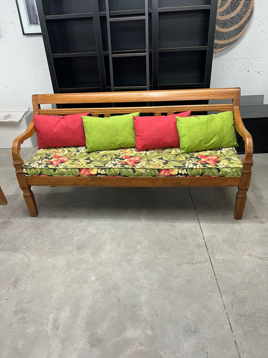 Banco madeira maciça com braço e estofados com almofadas. Mafuá