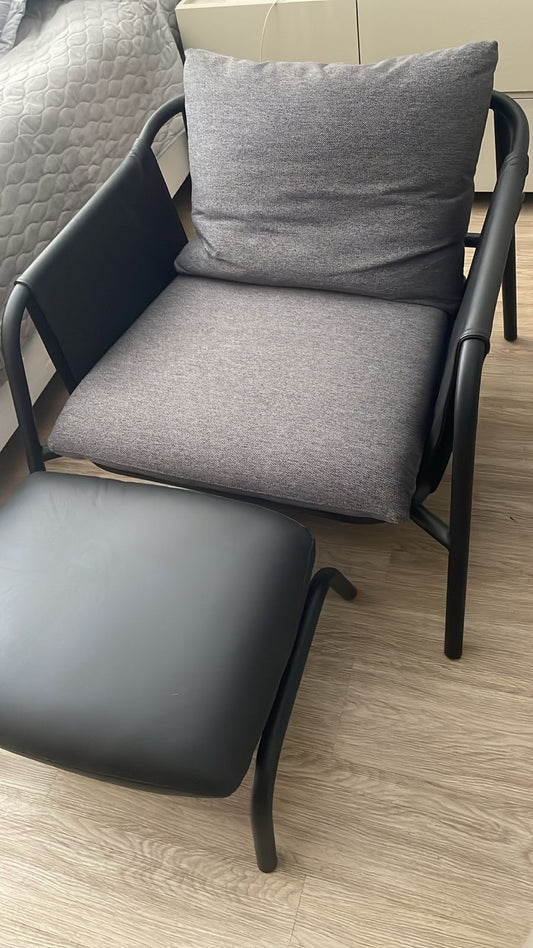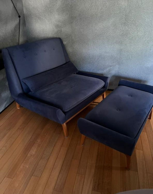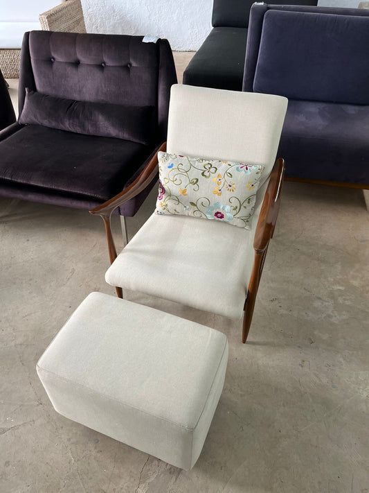 Poltrona para leitura, com puff em tecido e pés em madeira