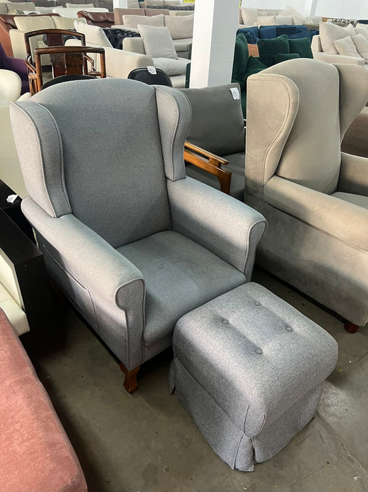 Poltrona com puff estilo provençal, tecido cinza, pés de madeira. Sombra e Verão.