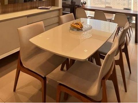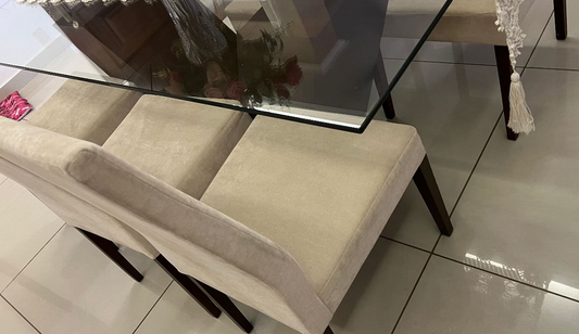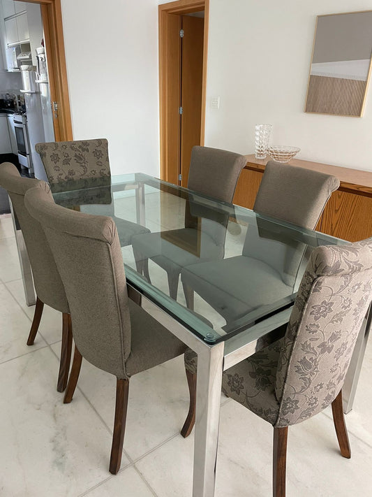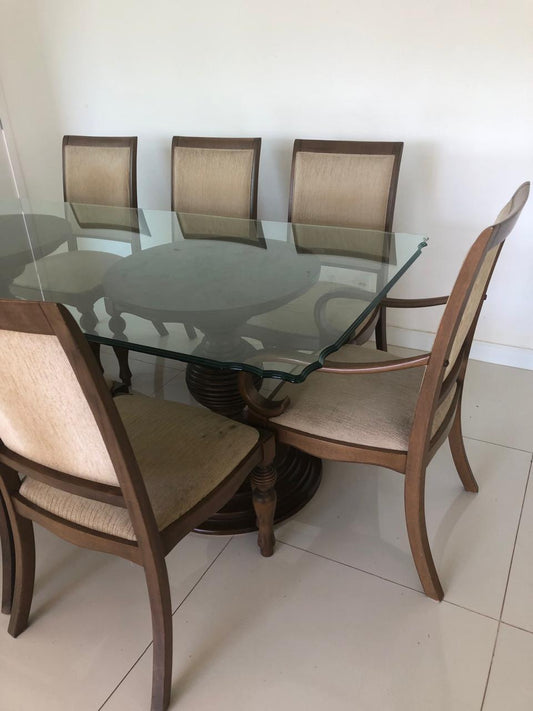 Conj. Mesa Líder, tampo de vidro e seis cadeiras madeira e suede