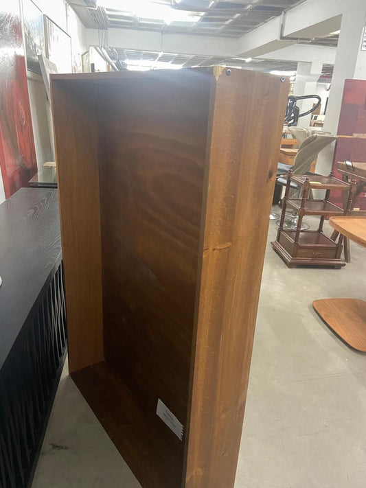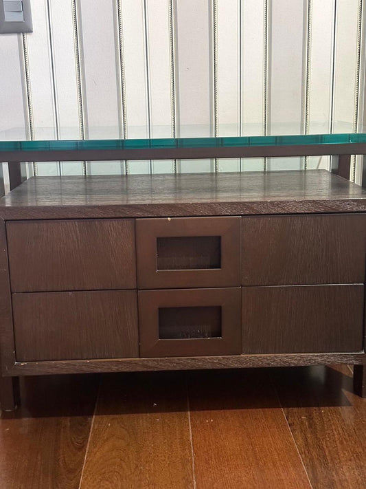 Mesa de cabeceira madeira escura, 2 gavetas, nicho tampo de vidro