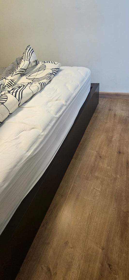 Cama Queen Prima Linea de madeira maciça com cabeceira e colchão Simons