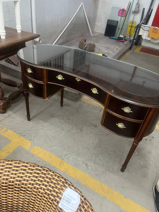 Escrivaninha em formato rim com acabamento em rádica - estilo Luis IX - com tampo de vidro