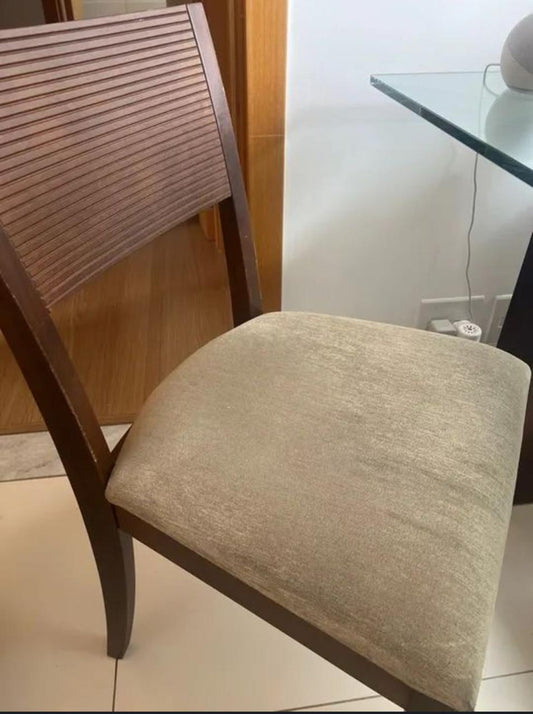 Mesa de jantar com vidro laqueado + 8 cadeiras revestidas de material lavável