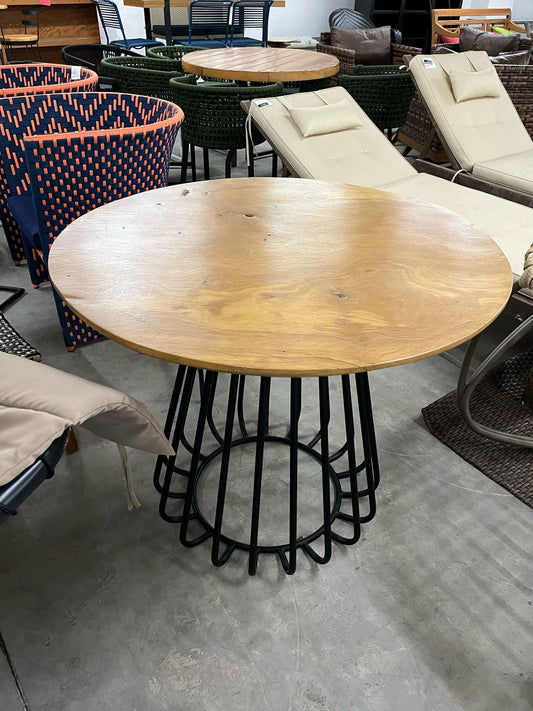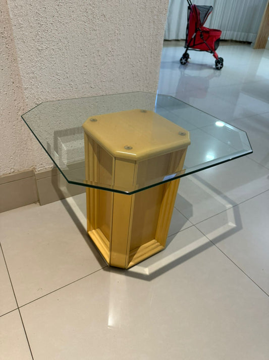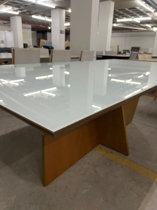 Mesa de jantar de madeira com tampo de vidro laqueado
