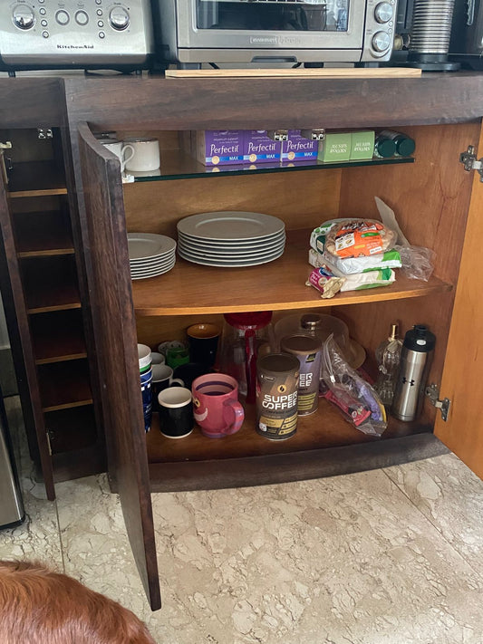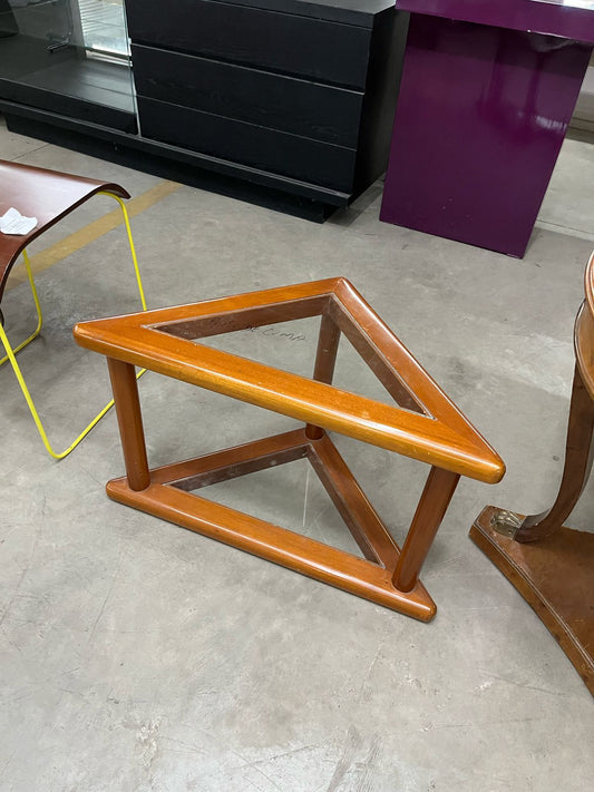 Mesa de canto triangular em madeira, acabamento em mogno, 2 vidros lisos e transparentes no topo e na base