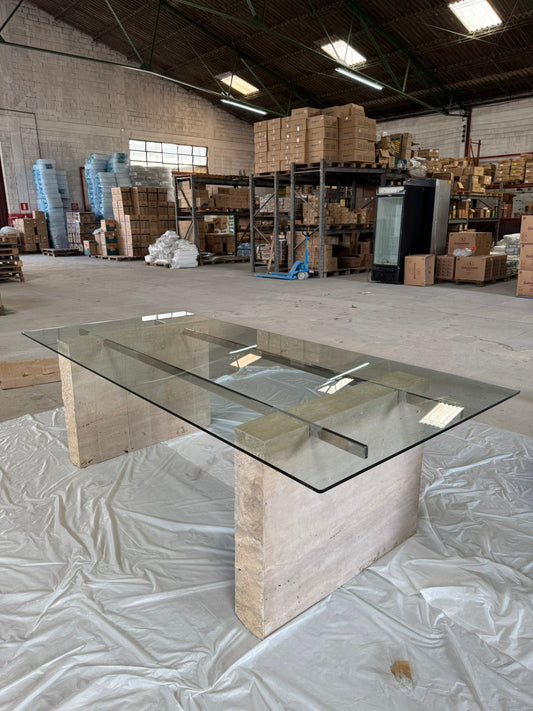 Mesa com tampo em vidro incolor de 10mm temperado com haste inox e os pés em travertino romano