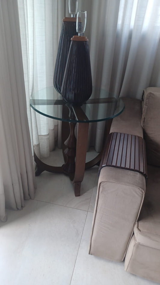 Mesa lateral madeira e vidro (tampo e base), detalhe em dourado fosco