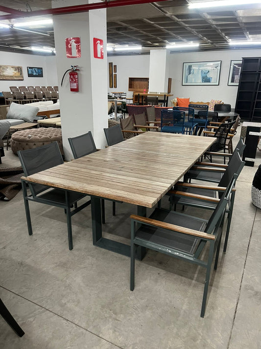 Mesa Farah com tampo de madeira cumaru + 6 cadeiras aquarela do Brasil alumínio e madeira cumaru MAC