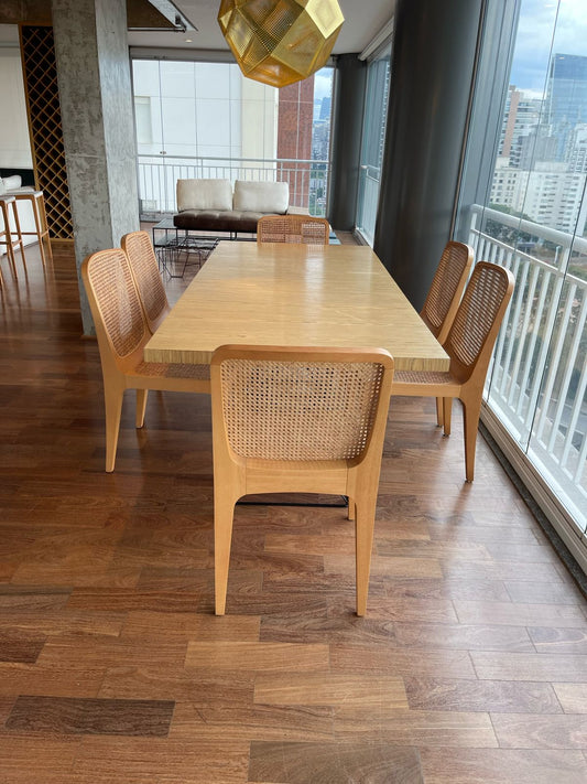 Mesa de jantar com tampo em vidro e pés em madeira trabalhada Sierra