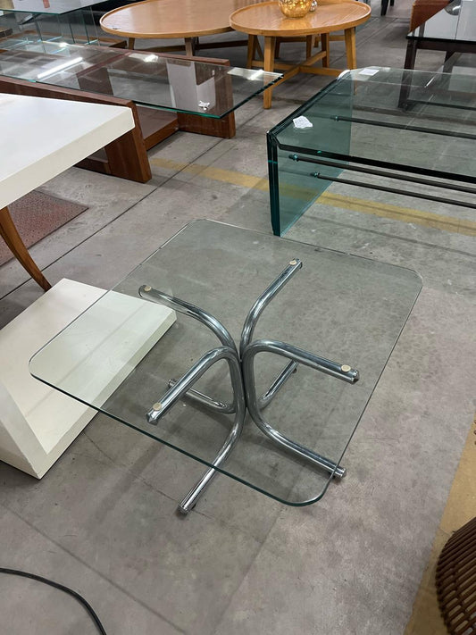 Mesa lateral tampo de vidro, pé em cruz arredondado