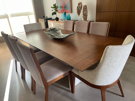 Conj. mesa com pés de madeira e tampo de vidro + 8 cadeiras de madeira estofadas