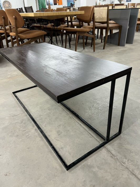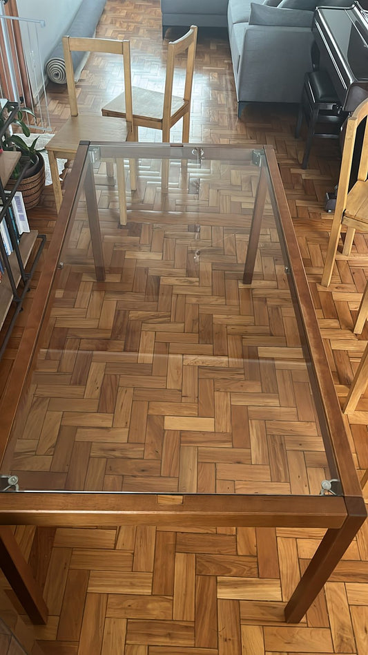 Mesa retangular com estrutura em madeira e tampo em vidro