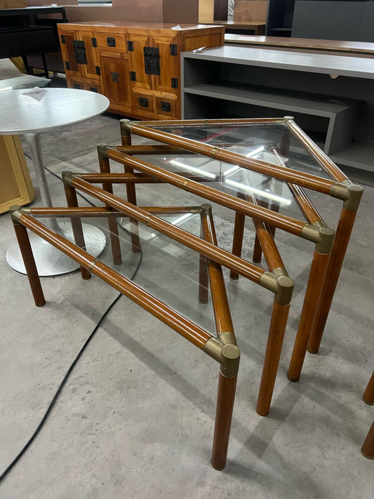Conj. 4 mesas lateral de madeira triangulares com tampo de vidro