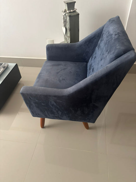 Poltrona para leitura, com puff em tecido e pés em madeira