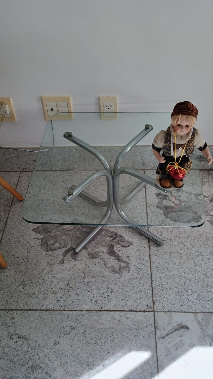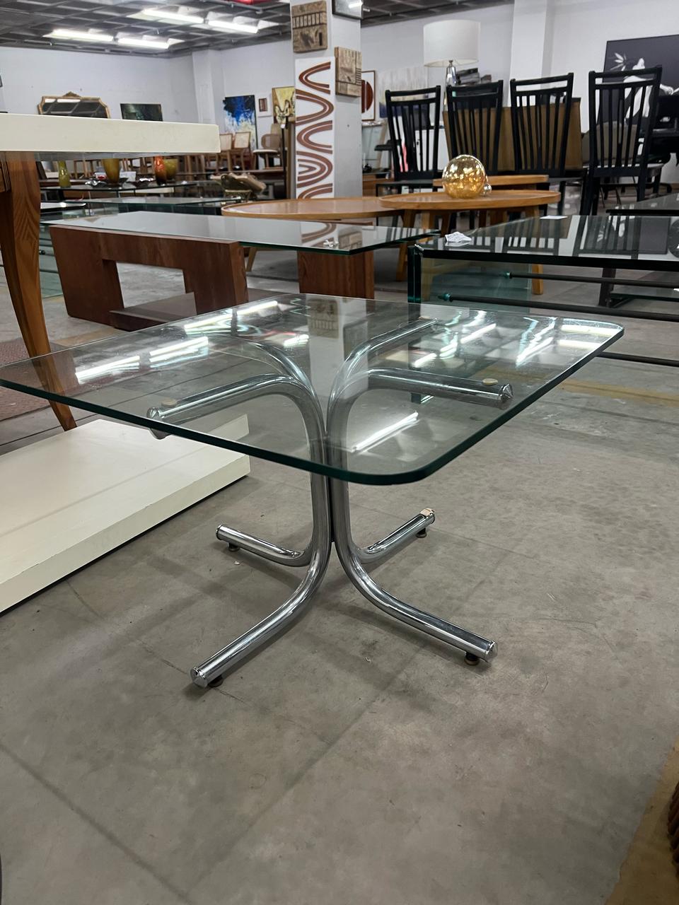 Mesa lateral tampo de vidro, pé em cruz arredondado