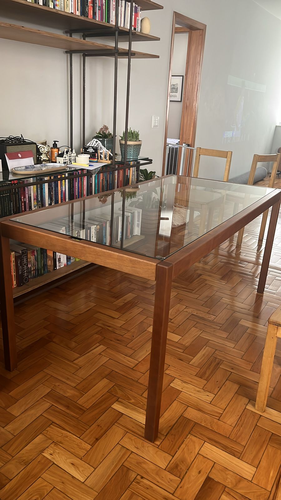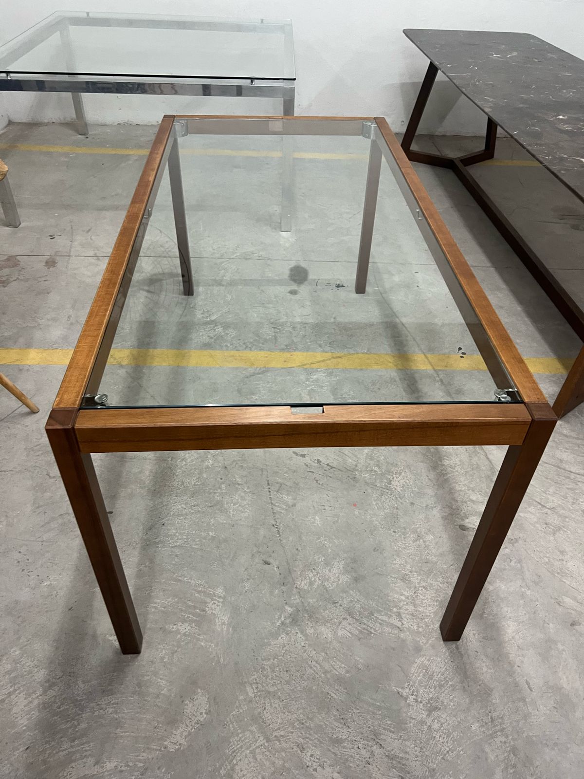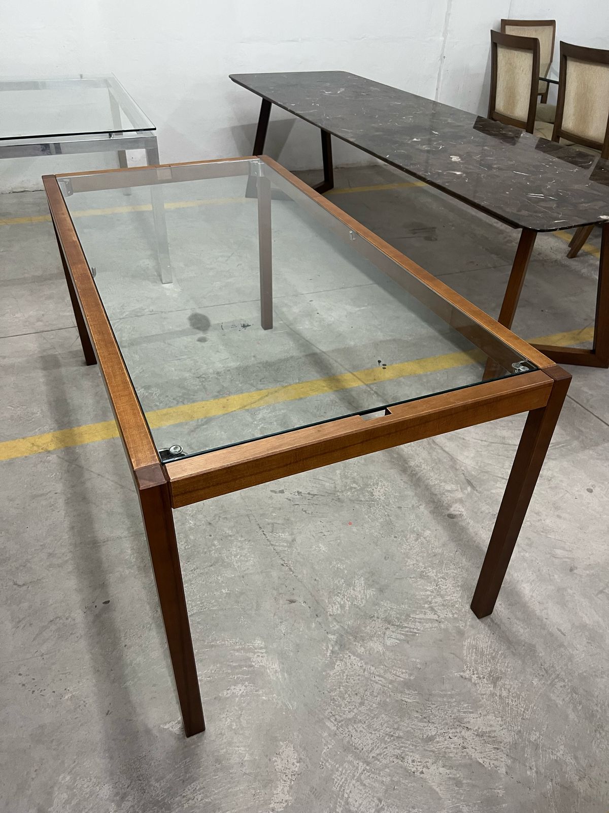 Mesa retangular com estrutura em madeira e tampo em vidro